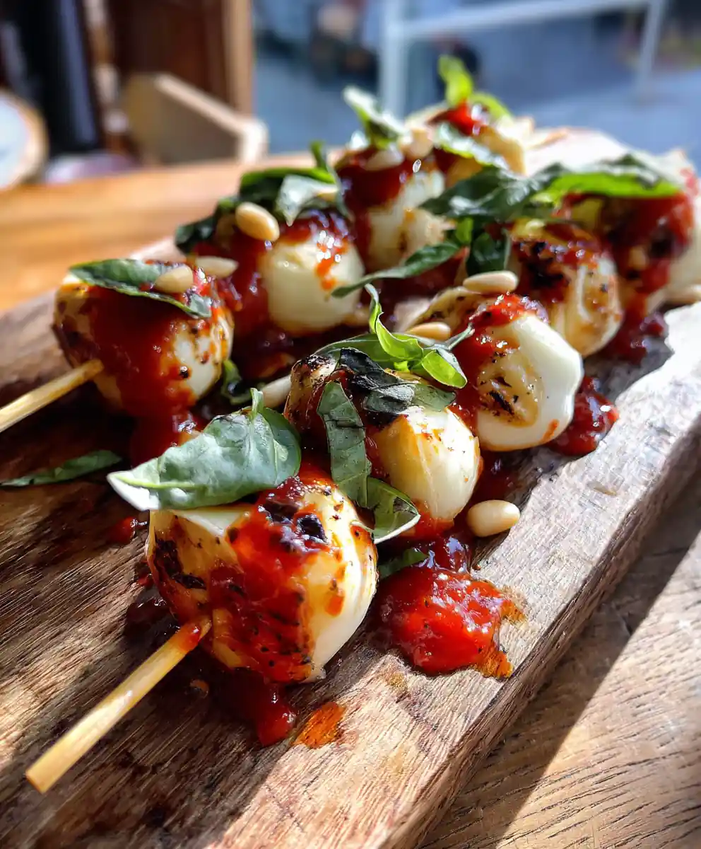 6. Grill Skewers: Grill skewers for 2-3 minutes per side until mozzarella softens.
