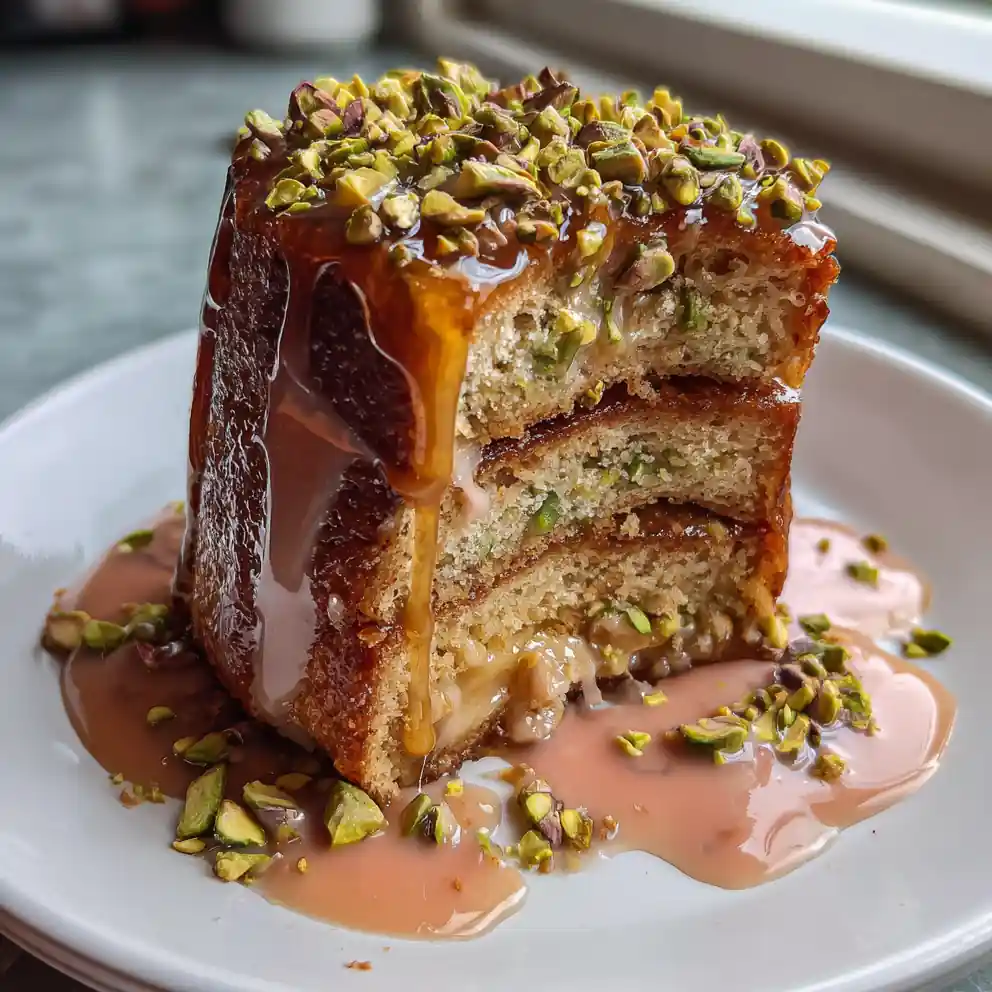 8. Glaze and Serve: Whisk together powdered sugar, rose water, and milk to form a pourable glaze. Drizzle generously over the cooled cake. Immediately scatter chopped pistachios over the wet glaze and serve warm or at room temperature.