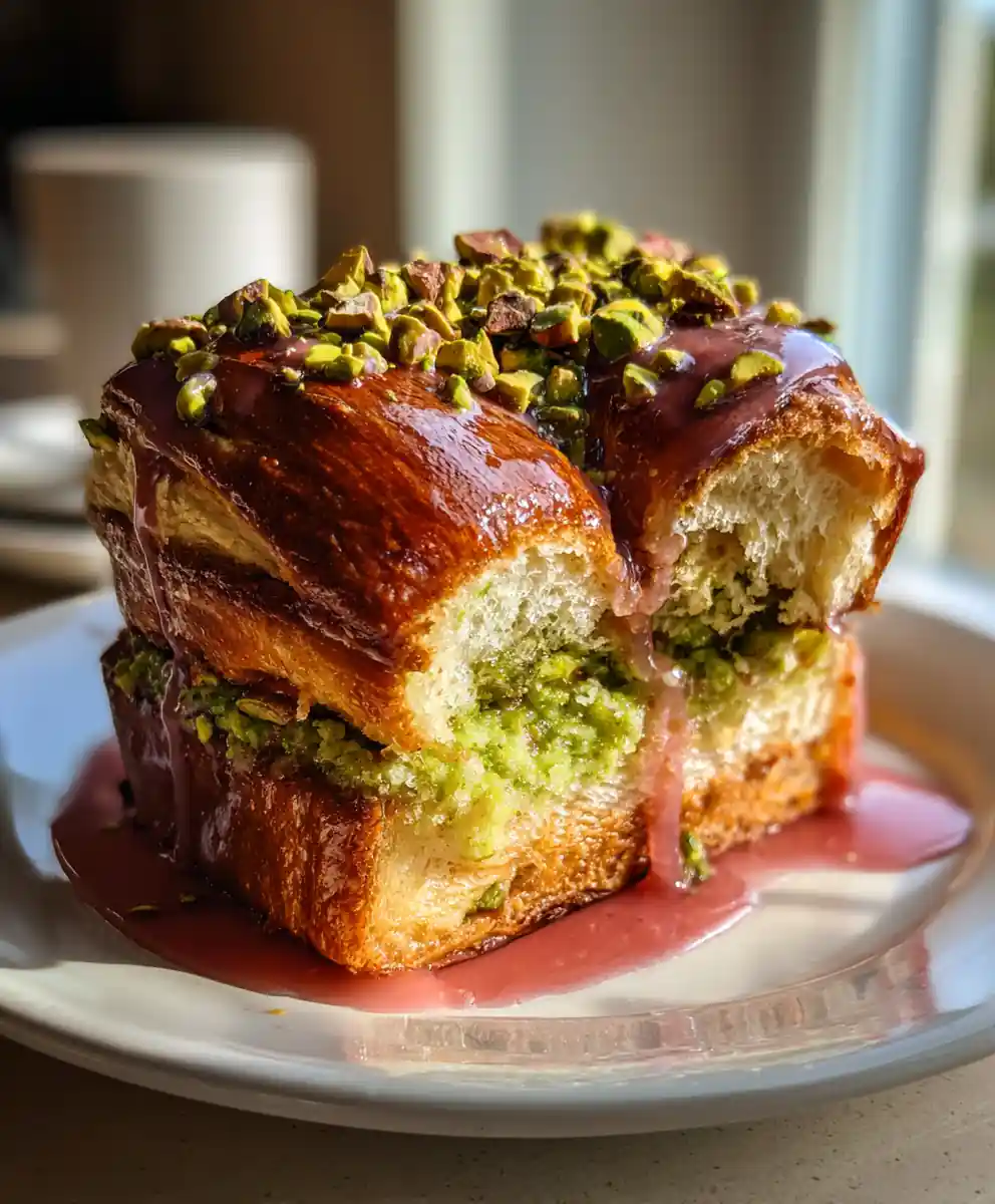 The contrast between the pink rose glaze and the vibrant green pistachios is key to this recipe’s elegance. Scatter the chopped pistachios generously immediately after applying the glaze so they stick properly. Serve the king cake on a simple white platter to let the colors pop, making it a truly festive centerpiece.