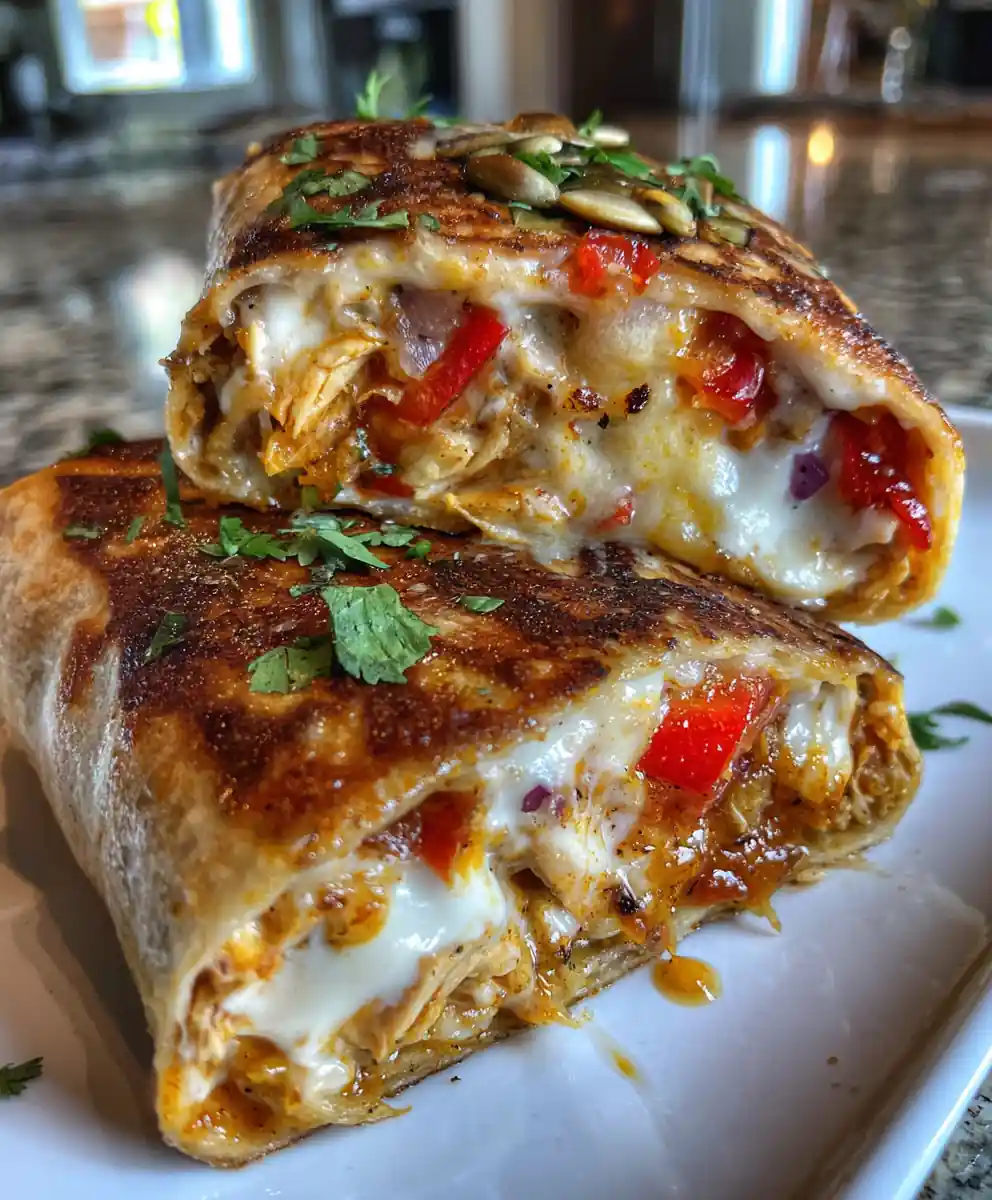 - Plate and Garnish: Place each baked chimichanga on a plate. Cut each chimichanga in half diagonally to reveal the creamy swirl of the chipotle-lime crema inside. Drizzle generously with the warmed crema. Scatter toasted pepitas and fresh cilantro leaves over the top, and finish with a light dusting of lime zest for a vibrant touch.