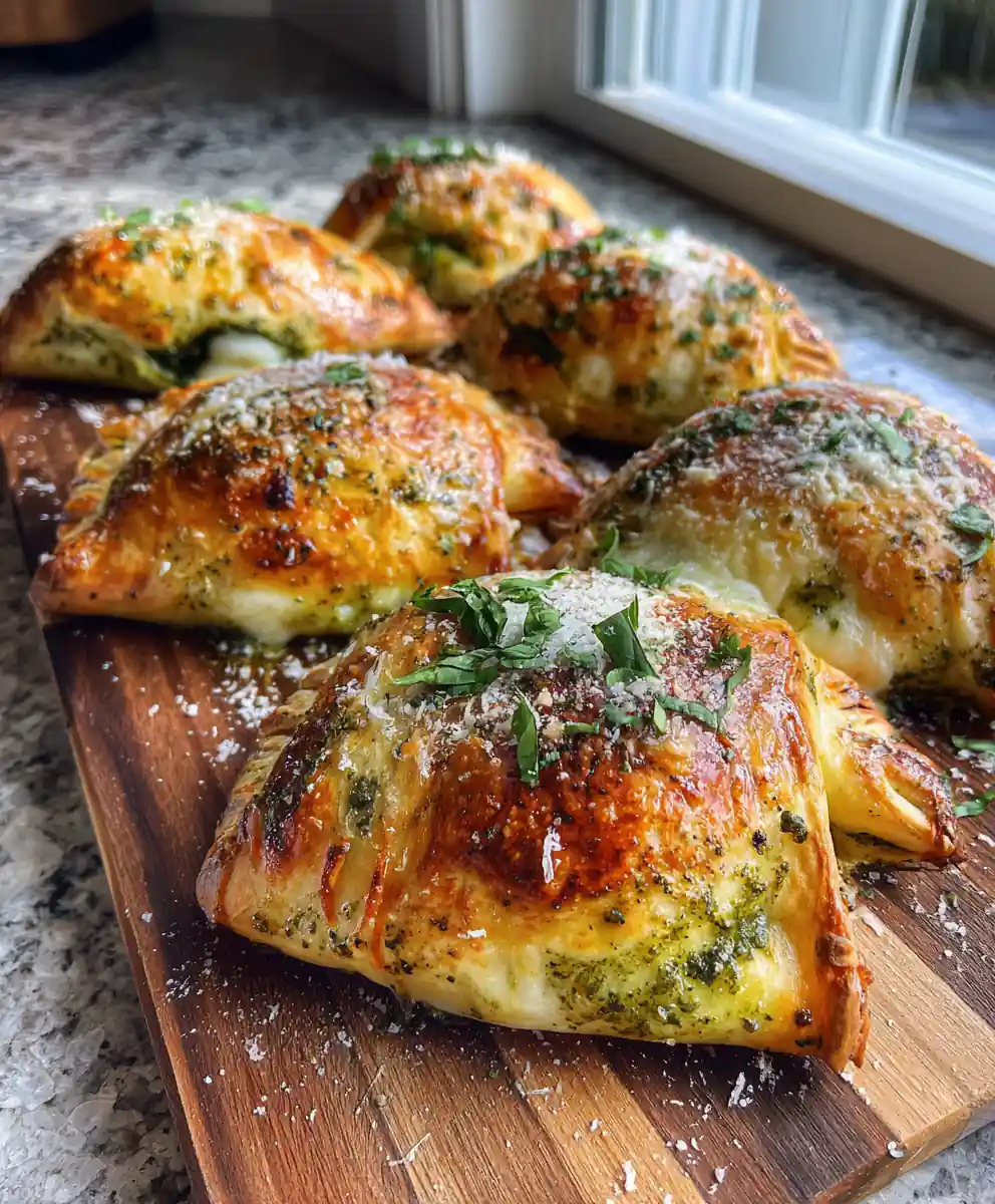 - Bake to Golden Perfection: Preheat the oven to 200ยฐC (400ยฐF). Line a baking sheet with parchment paper and place the pockets seam-side down. Brush the tops of the pockets generously with the garlic-olive oil glaze. Bake for 15-18 minutes, or until the crust is golden brown and the cheese is bubbling.