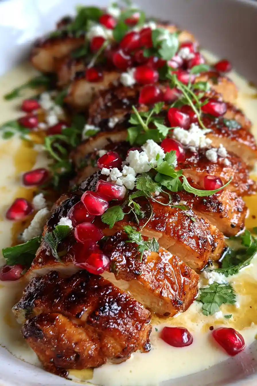 - Assemble & Garnish: Spread sauce, slice chicken, drizzle with juices, and garnish.