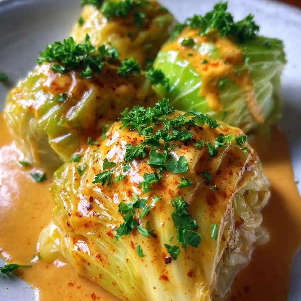 A creamy boiled cabbage recipe featuring tender cabbage wedges in a rich sauce infused with roasted garlic and smoked paprika, perfect as a side dish or light main course.