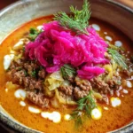 This comforting hamburger cabbage soup is a hearty, wholesome meal perfect for busy weeknights, offering a complete and satisfying dish for the whole family. It features a savory broth with lean ground beef, tender cabbage, and a flavorful blend of vegetables and spices, finished with a tangy pickled red onion relish and creamy dill creme fraiche.