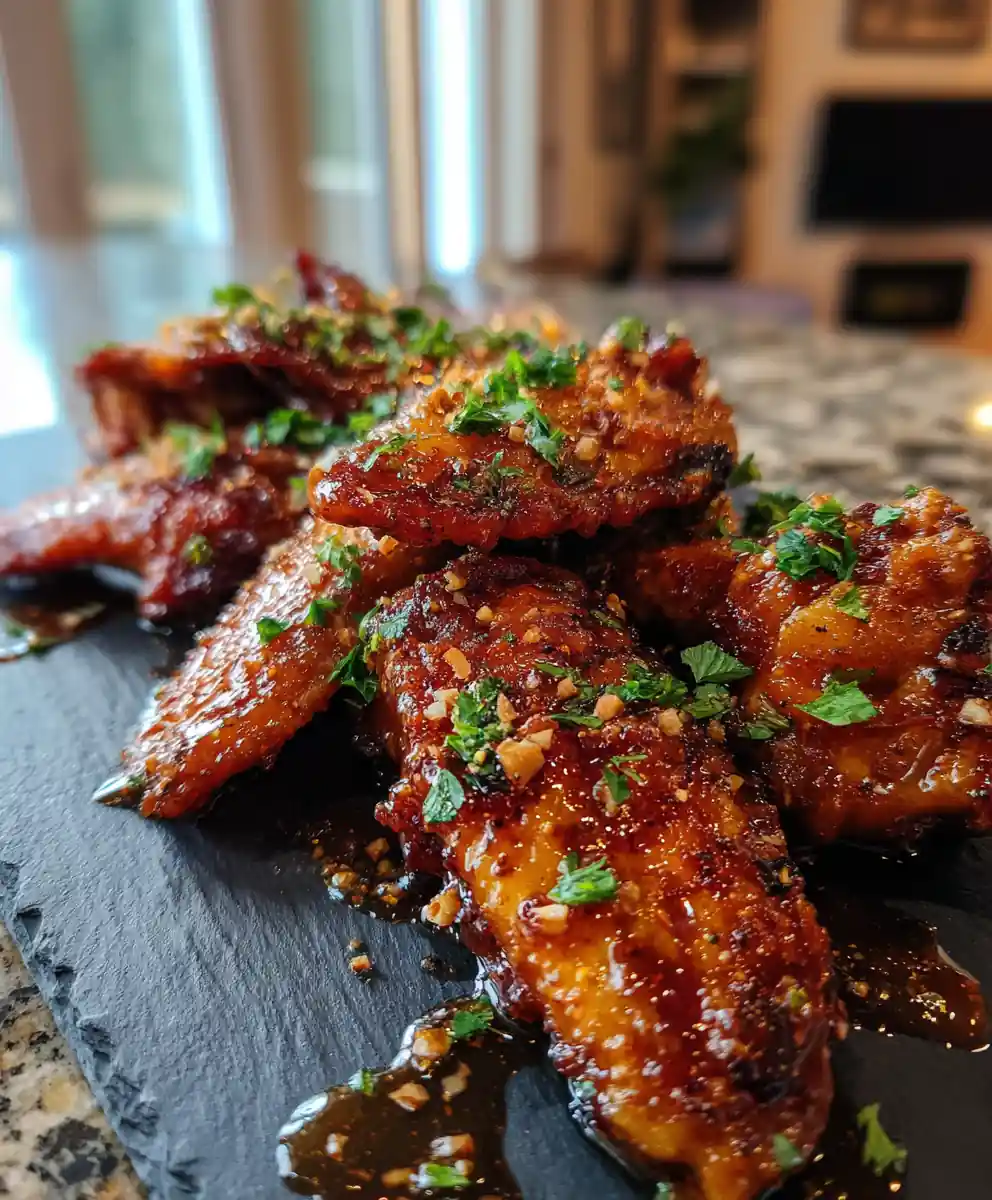 - Garnish and Serve: Plate the wings attractively, arranging them in a fan shape. Finish with a light drizzle of any extra glaze, a sprinkle of pecan crumble, and a few dots of freshly chopped cilantro for a pop of color. Serve immediately.