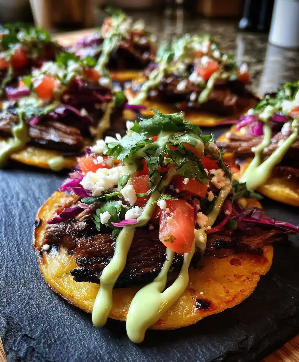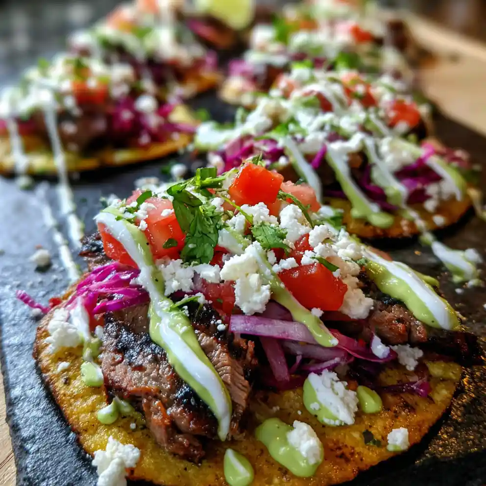 - Assemble the Tostadas: Now for the fun part! Layer the warm, bean-coated tostadas with the thinly sliced carne asada, diced tomato, shredded red cabbage, and a few rings of the quick-pickled red onion. Drizzle generously with the avocado lime crema, creating a beautiful zigzag pattern. Finally, sprinkle with crumbled queso fresco and the remaining chopped cilantro.
