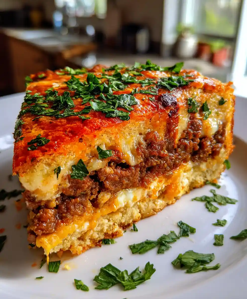 6. Finish and Serve: Bake the **cheeseburger pie** for 25-30 minutes, or until the biscuit topping is golden brown and cooked through, and the red pepper swirl is lightly caramelized in spots. Let the pie rest for 5-10 minutes before serving; this allows the filling to set and prevents the slices from falling apart. Garnish generously with finely chopped fresh flat-leaf parsley before serving warm directly from the skillet.
