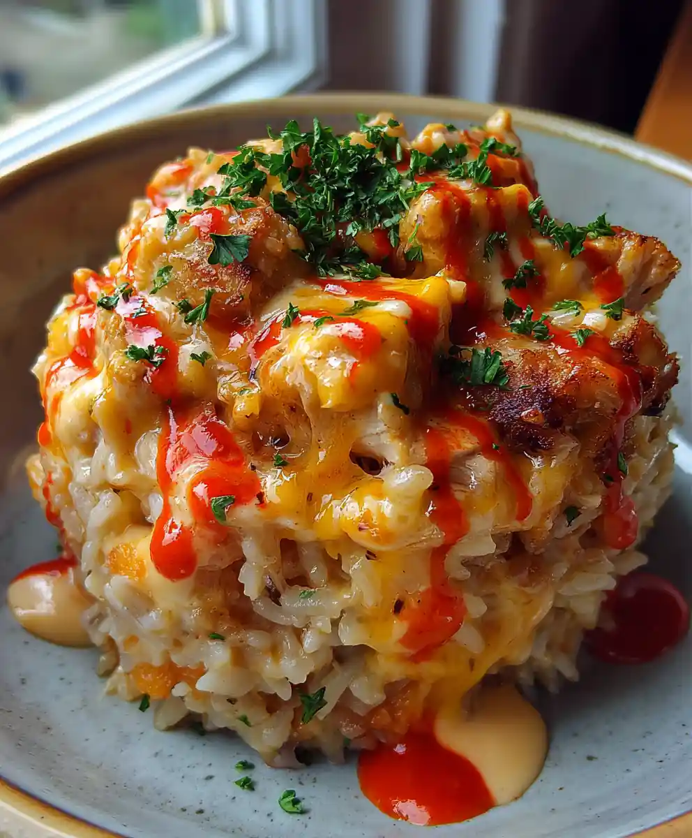 Serve generous portions of the cheesy chicken and rice in rustic bowls or on a matte white plate to highlight the colors. Spoon a tablespoon of the remaining Red Pepper Swirl sauce over each serving and garnish with fresh parsley for a vibrant green contrast against the warm, cheesy base.
