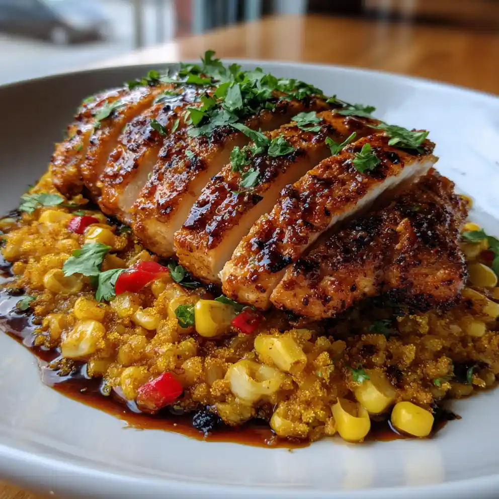 9. Plate and Serve: Spread the roasted corn and pepper mixture on a plate as a colorful base. Place a sliced chicken breast on top of the vegetables. Drizzle the chipotle-lime glaze over the chicken in a zig-zag pattern. Garnish with chopped cilantro and a pinch of fresh lime zest. Serve immediately.