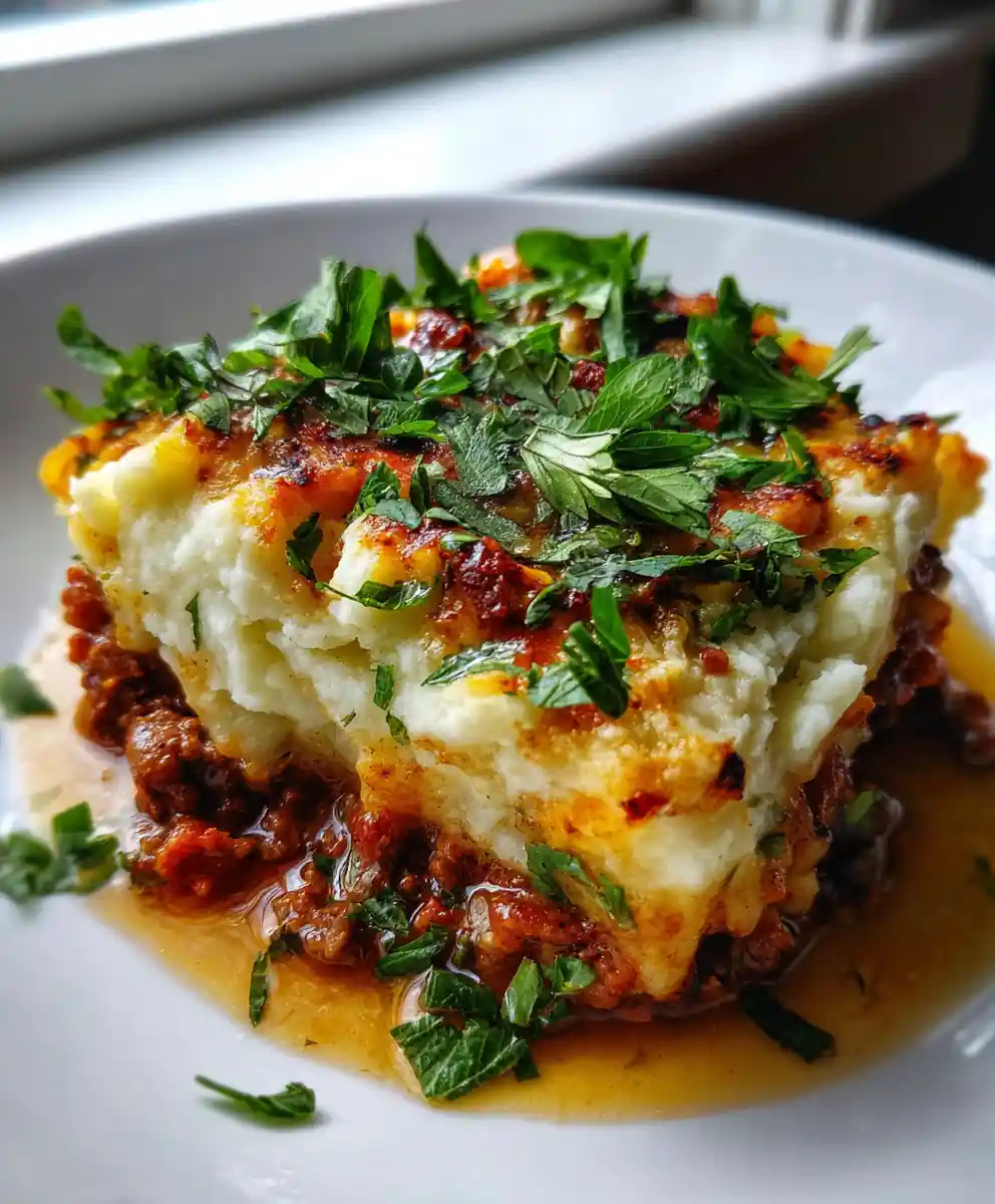 A comforting shepherd’s pie recipe featuring a harissa-spiced lamb filling and a tangy whipped feta mashed potato topping, perfect for an elevated weeknight meal.