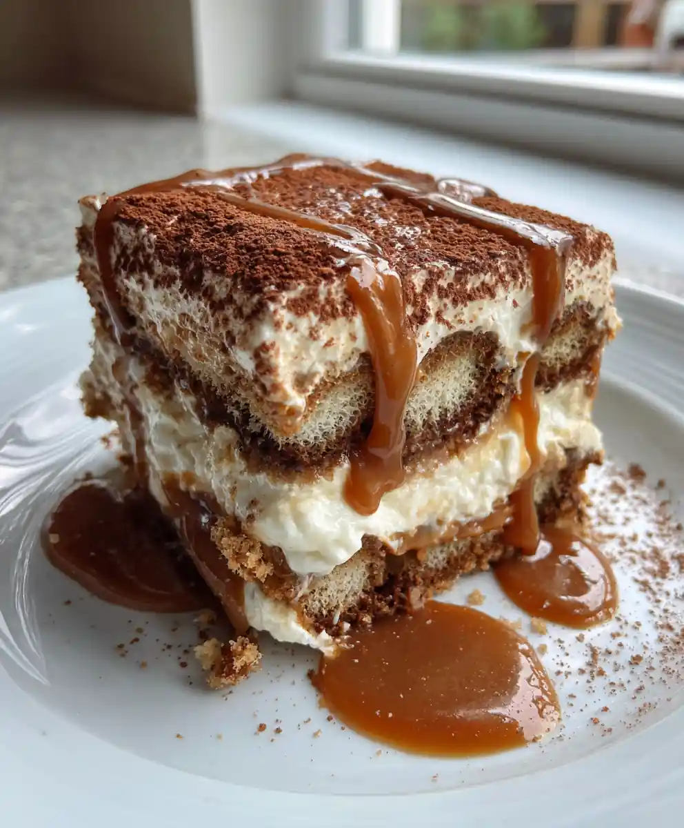 A cozy twist on classic tiramisu featuring a rich mascarpone cream and layers of coffee-soaked ladyfingers, elevated by a decadent homemade spiced caramel sauce swirled throughout.