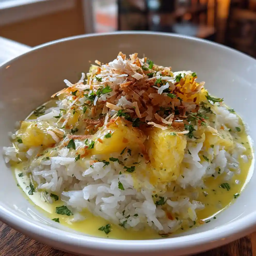 8. Plate and Garnish: Divide the rice among shallow bowls. Top with the warm sautรฉed pineapple chunks. Drizzle the remaining lime-coconut cream in a thin ribbon across the surface of the rice. Sprinkle generously with toasted coconut flakes and finish with a pinch of fresh, chopped cilantro.