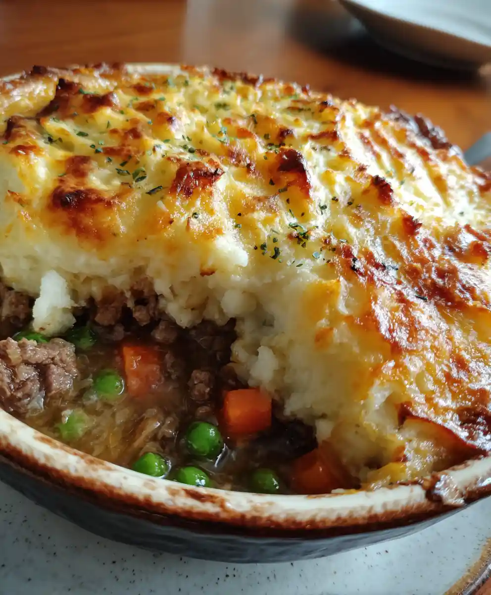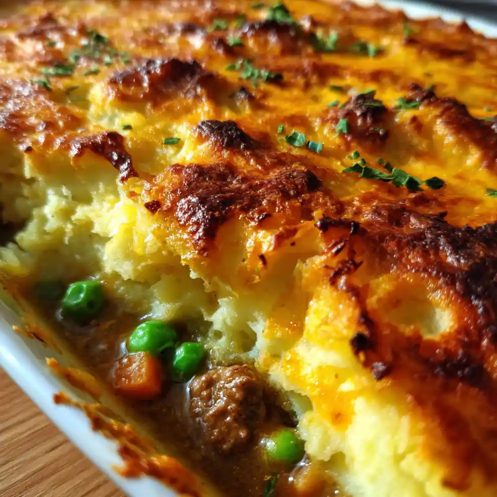 This comforting cottage pie recipe features a savory beef filling topped with a golden cheddar mashed potato crown and vibrant green peas. It’s a hearty and satisfying meal, perfect for families.