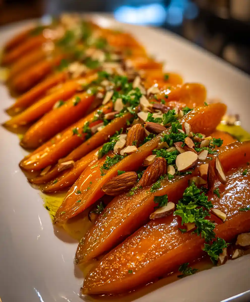 7. Plate and Garnish: Transfer the warm carrots to a serving dish. Arrange them artfully – a fan shape or overlapping rows adds visual appeal. Sprinkle with toasted sliced almonds for a delightful crunch and chopped fresh parsley for a pop of color and freshness. Finally, drizzle a thin stream of honey across the plate for extra shine and a touch of sweetness.