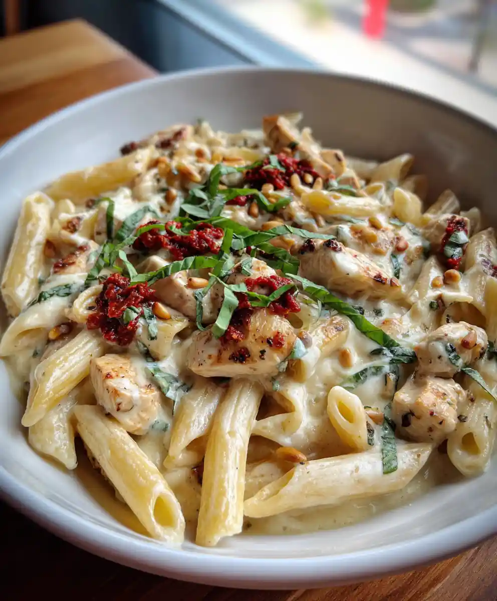 This creamy mozzarella chicken pasta features tender chicken, perfectly cooked penne, and a vibrant sun-dried tomato pesto swirl for a comforting yet sophisticated meal. It’s a flavorful dish perfect for family dinners or gatherings.