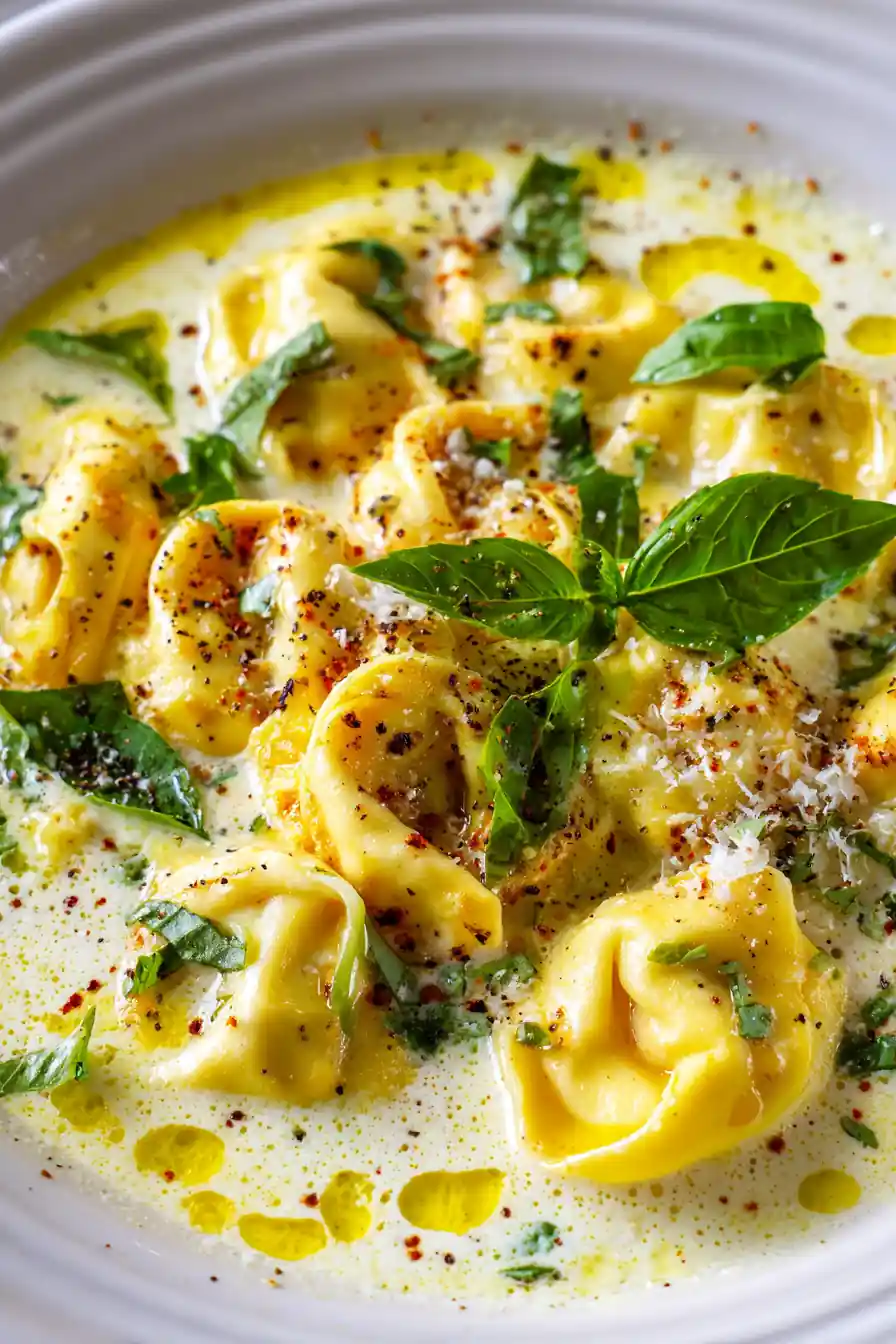 - Serve and Garnish: Ladle the creamy tortellini soup into wide, white ceramic bowls. Swirl a thin line of extra-virgin olive oil on the surface of each bowl. Sprinkle generously with grated Parmesan cheese and garnish with torn fresh basil leaves. Finish with a light grind of black pepper.