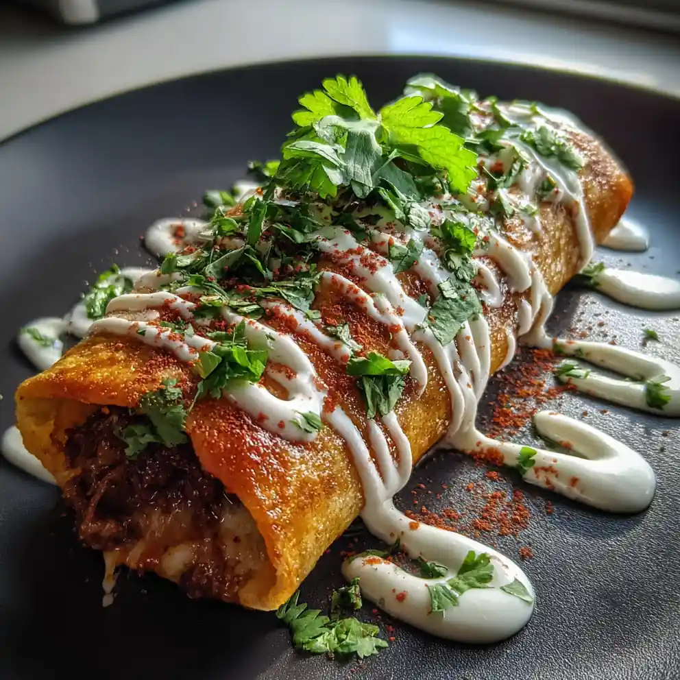 These crispy beef chimichangas are elevated with a vibrant roasted poblano cheese swirl and a zesty lime crema, creating a flavorful and satisfying meal. Perfect for a weeknight dinner or weekend gathering, this recipe delivers a delightful explosion of taste in every bite.