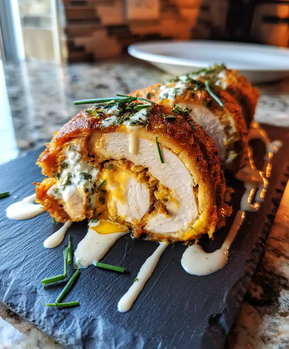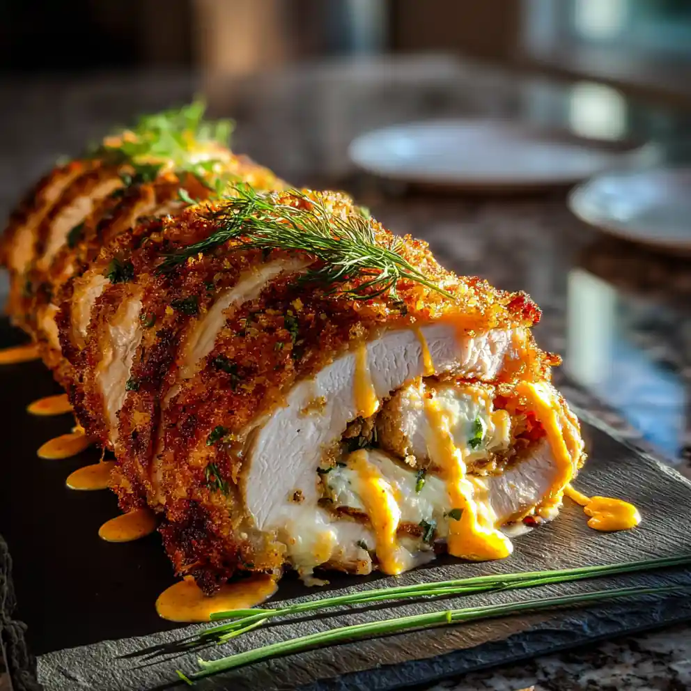 8. Rest, Sauce, and Serve: Remove the chicken rolls from the oven and let them rest for 5 minutes before slicing. This allows the juices to redistribute, resulting in a more tender and flavorful chicken. While the chicken rests, prepare the paprika-ranch drizzle by stirring together the extra ranch dressing and smoked paprika. Slice each roll diagonally to reveal the molten goat cheese center. Arrange on a serving plate, drizzle with the paprika-ranch sauce, and garnish with finely sliced chives and a few dill fronds.