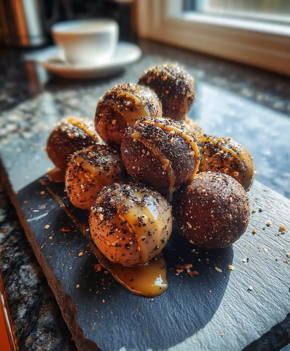 9. Plate and Serve: Arrange the finished Espresso-Caramel Core Tiramisu Truffles on a dark slate or matte black plate for a striking presentation. A decorative swirl of extra coffee-caramel drizzle and a final light dusting of cocoa powder will elevate the visual impact.