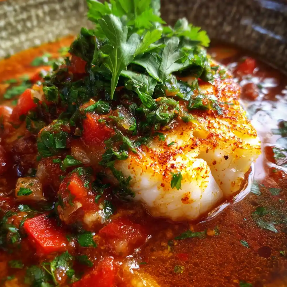- Garnish and Serve: While the fish cooks, combine the chopped fresh parsley and/or cilantro with 15 mL (1 tablespoon) extra virgin olive oil and a pinch of smoked paprika in a small bowl. Stir to combine. Ladle the hot fish stew into bowls, spooning the vibrant herb garnish over each serving for a bright pop of color and fresh aroma.