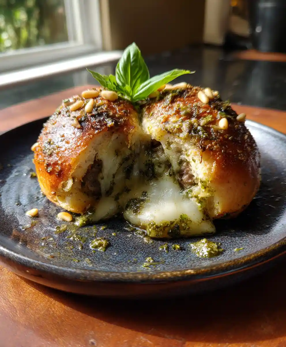 These Garlic Parmesan Cheeseburger Bombs are a delightful twist on a classic, featuring juicy beef, savory garlic, melted cheese, and a vibrant basil pesto and mozzarella center. Perfect for sharing and guaranteed to be a crowd-pleaser!