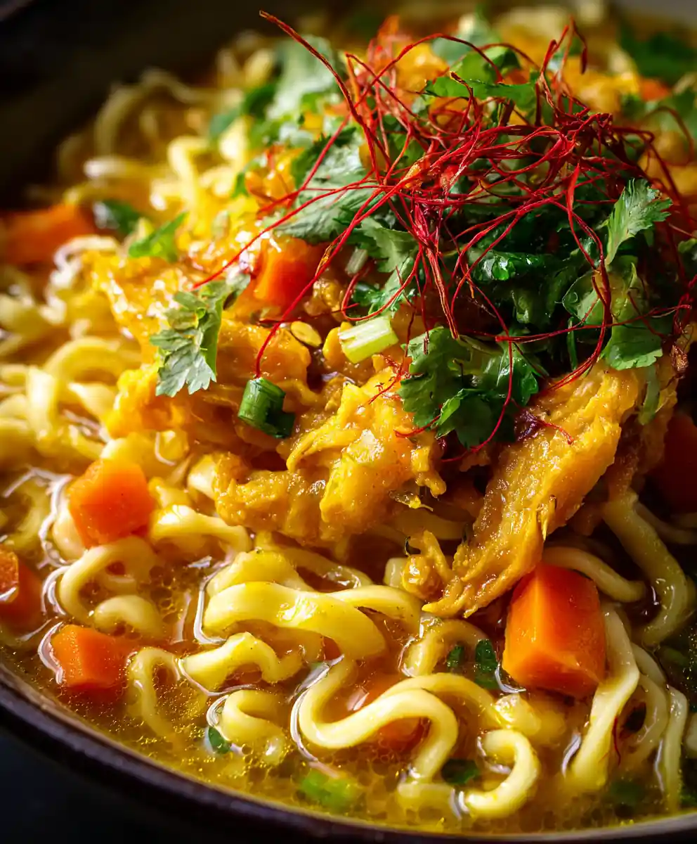 7. Serve and Garnish: Ladle the hot soup into individual bowls. Arrange a visible portion of the golden turmeric-ginger chicken in each serving. Generously sprinkle the crispy chili threads and fresh chopped cilantro leaves over the top.