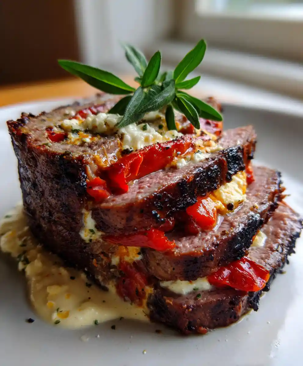 - Form the Loaf: Preheat oven to 160 C (325 F). Lightly grease a 23 cm x 13 cm (9-inch x 5-inch) loaf pan. Press half of the meat mixture evenly into the bottom of the pan. Spread the remaining pepper and feta paste (not the reserved portion) over the meat, leaving a small border. Top with the remaining meat mixture, pressing down very firmly to eliminate air pockets and ensure a compact, solid loaf. (If loose, knead meat for 2-3 more minutes).