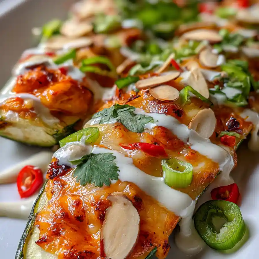 - Plate and Serve: Plate each zucchini boat on a clean plate. Drizzle with any remaining buffalo yogurt sauce (if desired). Scatter the toasted almond slivers, chopped cilantro, and sliced green onion over the boats. A thin drizzle of ranch-style dressing adds a cool contrast to the heat.