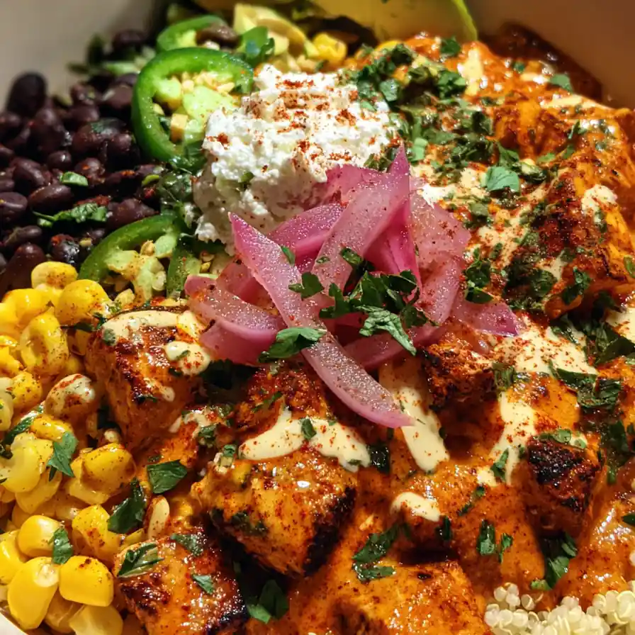 - Assemble Bowls: Layer quinoa, chicken, beans, and corn. Drizzle with sauce.