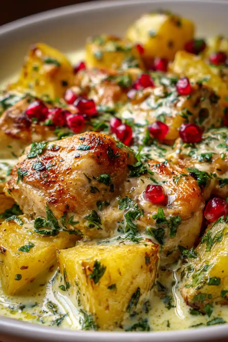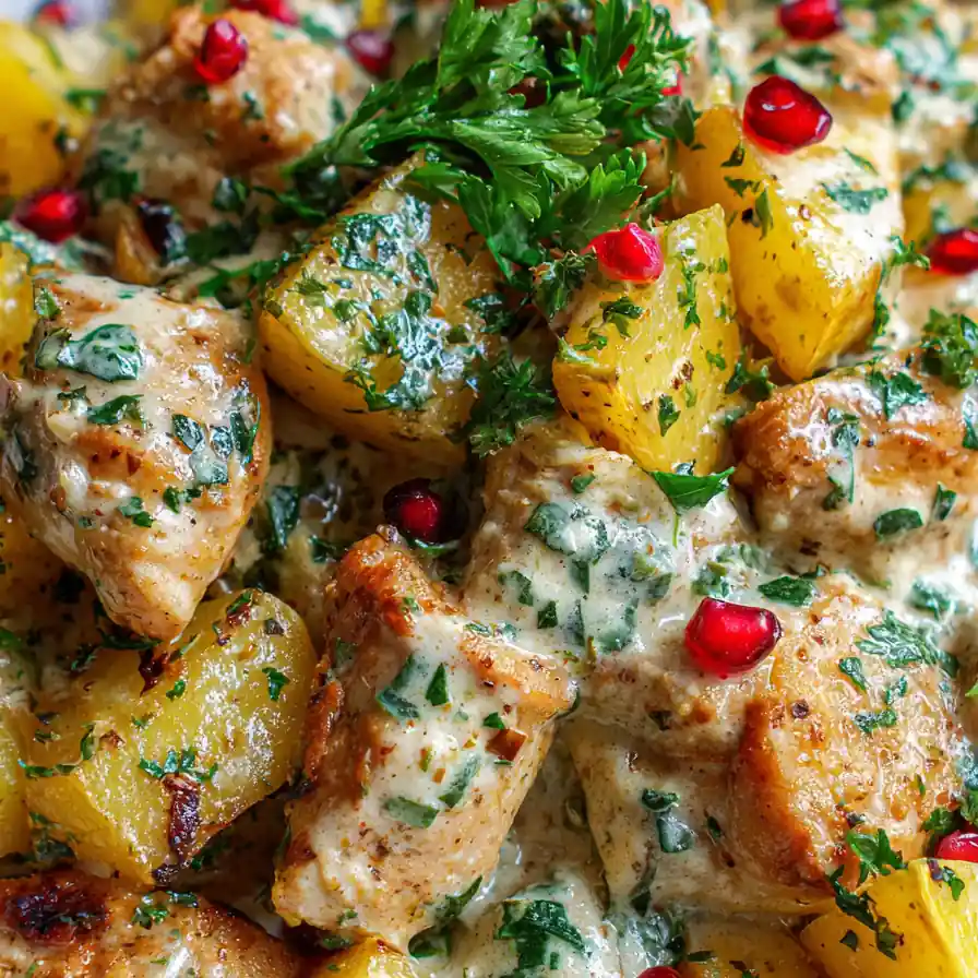 This recipe delivers a satisfying and protein-packed meal of tender chicken thighs and roasted Yukon Gold potatoes in a creamy garlic sauce. It’s a comforting classic with a healthy twist, elevated by smoked paprika and pomegranate molasses.