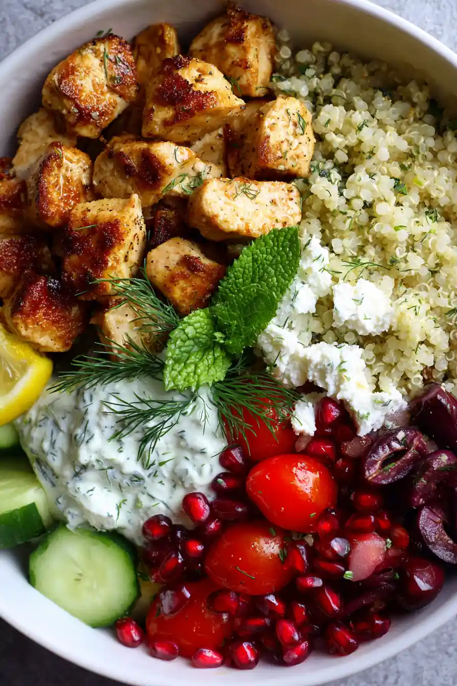 - Assemble Bowls: Layer quinoa, chicken, salad, and tzatziki in bowls. Garnish with pomegranate and mint.