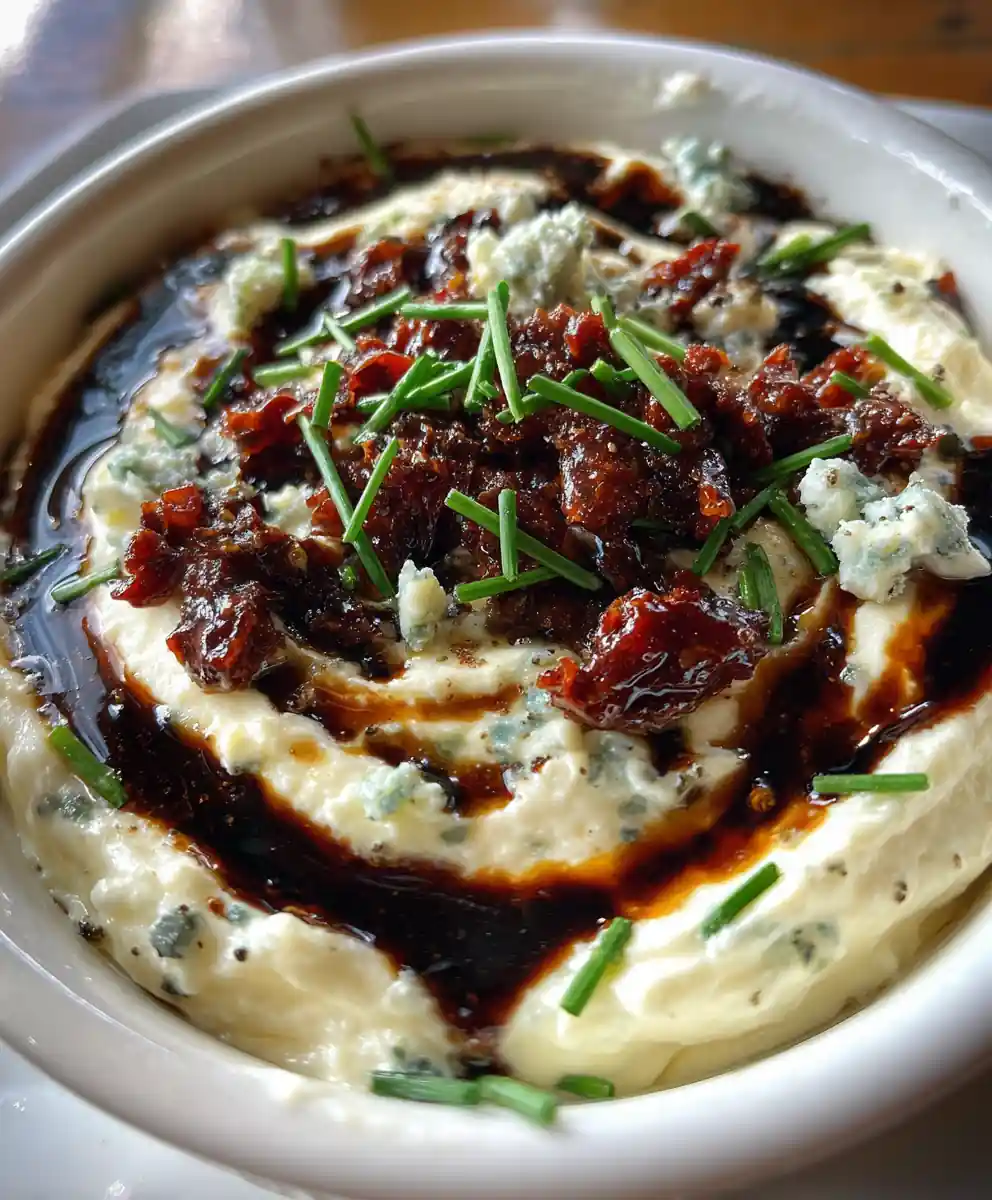 - Plating & Visual Styling: Serve the dressing in a clean, shallow white ceramic bowl, showcasing the creamy base and dark red-brown swirls. Drizzle the remaining 15 ml (1 tablespoon) of balsamic glaze sparingly over the surface in a loose zigzag. Sprinkle the reserved 50 g (1.8 oz) of crumbled blue cheese directly onto the swirls, then scatter the finely snipped fresh chives over the top for a vibrant green pop.