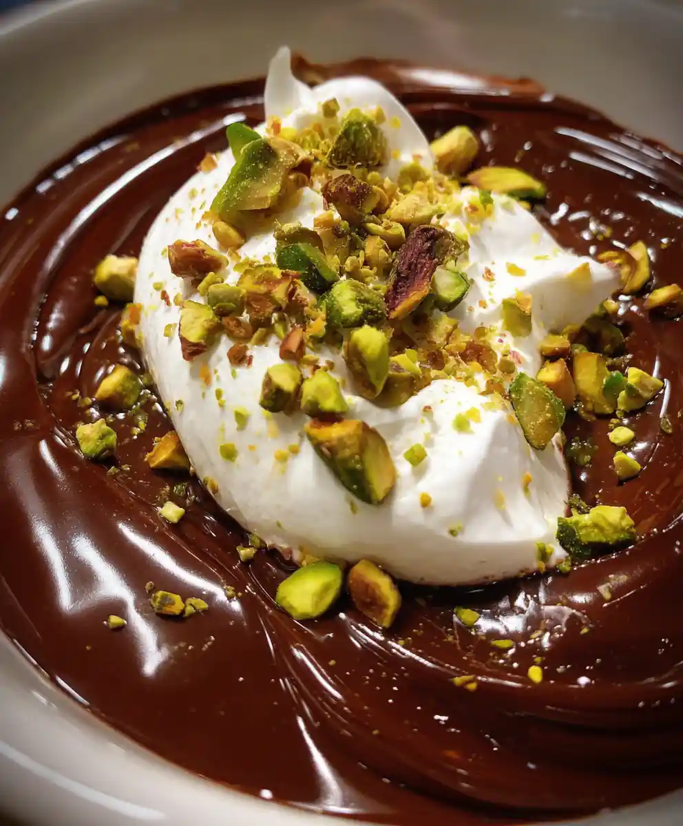 6. Style and Serve: Place a generous dollop of whipped cream onto the center of the warm dip. Sprinkle the toasted, roughly chopped pistachios generously over the cream and surrounding dip for vibrant green and white contrast against the rich brown. Serve immediately with your preferred dippers.