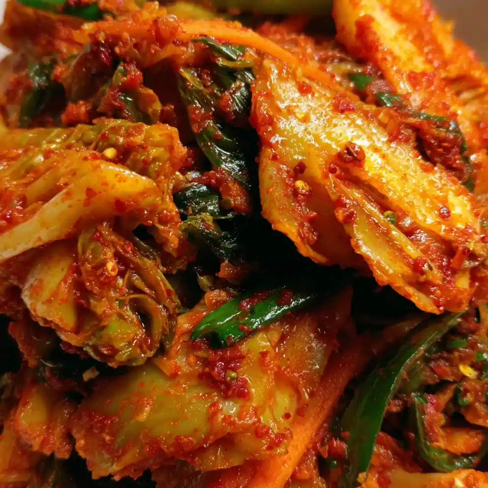 For vegan kimchi, use soy sauce or tamari instead of fish sauce. If kimchi tastes too salty, rinse cabbage more thoroughly next time. Adjust Gochugaru for desired spice level. Store Gochugaru in a cool, dark place to preserve color and flavor.