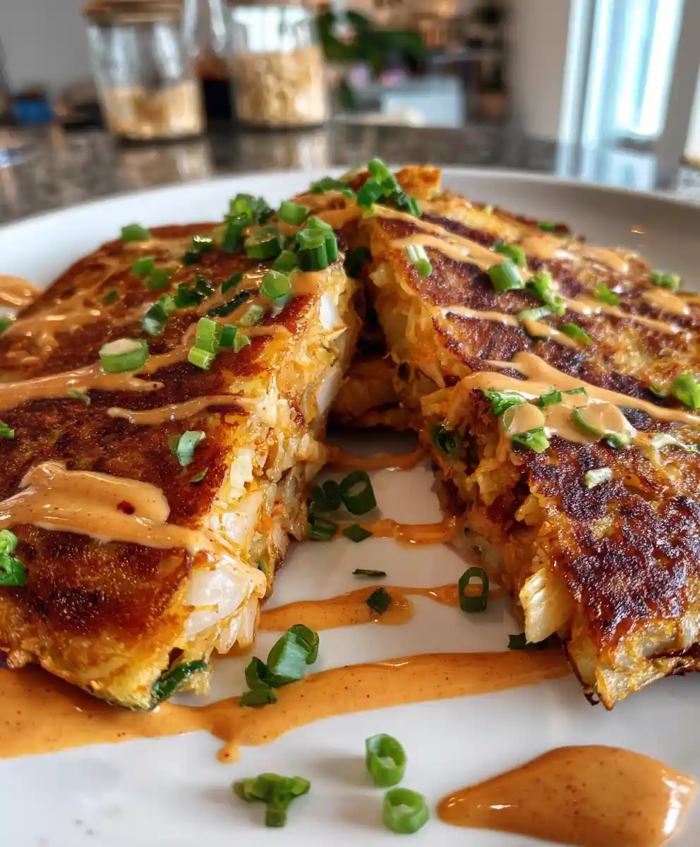5. Serve Hot (1-2 minutes rest): Transfer the cooked kimchi pancake to a warm plate and let it rest for 1-2 minutes. Slice the large pancake into 6-8 wedges using a sharp knife or pizza cutter. Arrange the wedges slightly fanned out on the plate for presentation, then generously drizzle with aioli and sprinkle with reserved green onions.