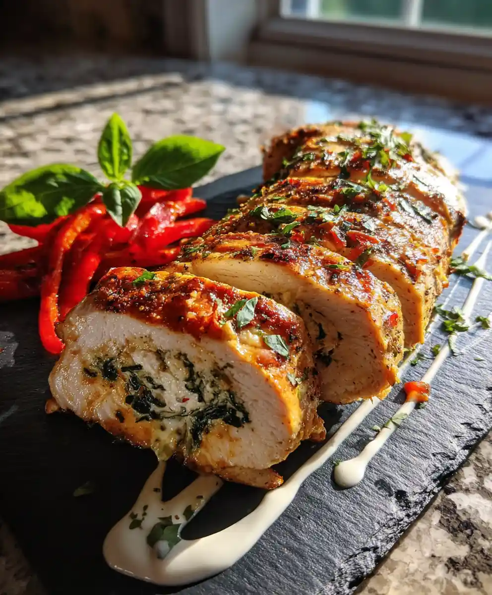 - Slice, Plate, and Garnish: Slice each chicken breast crosswise to reveal the vibrant lemon-zest mozzarella swirl. Arrange two halves on a plate, fanning the roasted pepper strips beside them. Drizzle the herb-yogurt sauce around the chicken and garnish with fresh basil leaves and a light sprinkling of extra lemon zest.