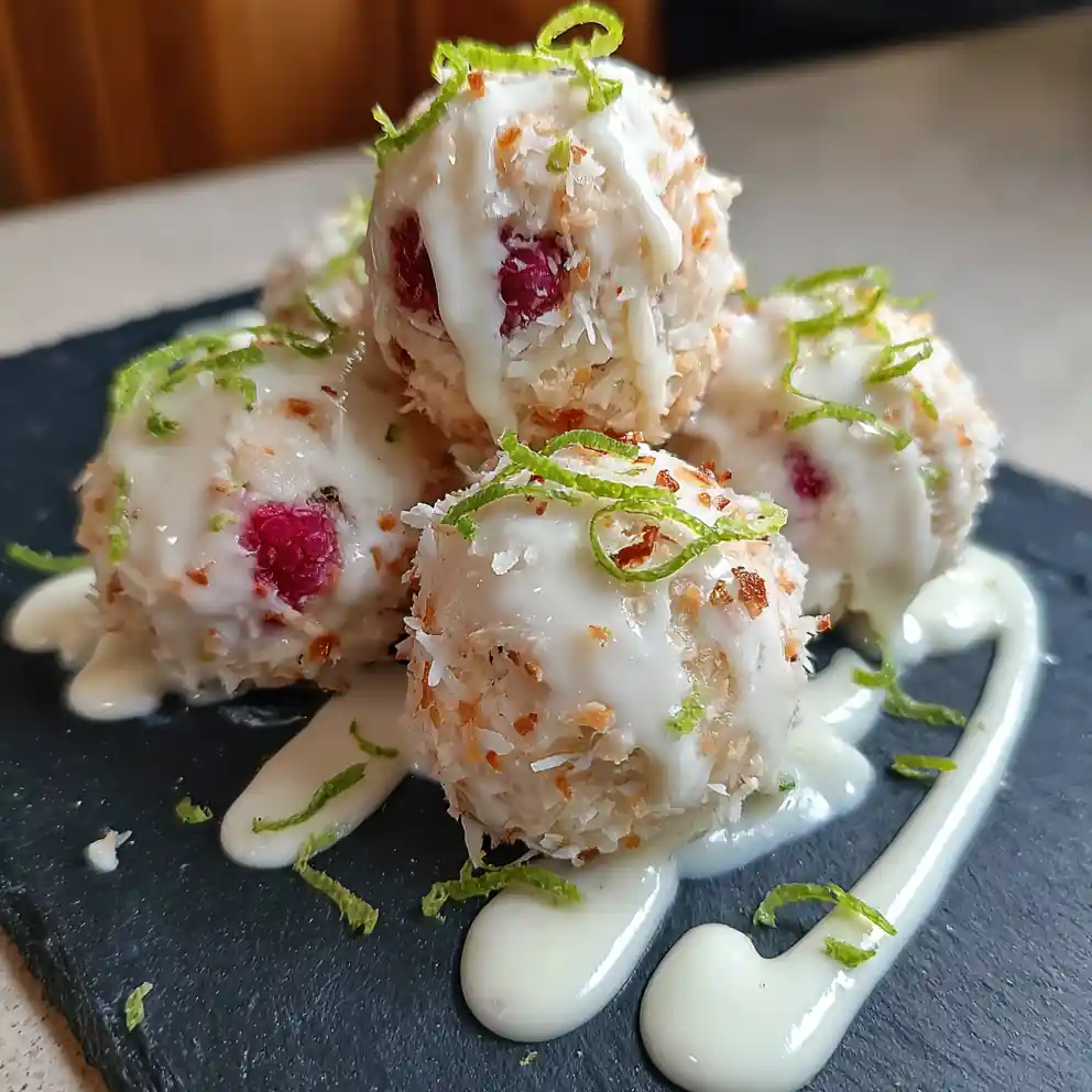 These no-bake raspberry coconut balls are a vibrant explosion of flavor, combining creamy white chocolate, tangy lime zest, and fresh raspberries. They’re easy to make and perfect for parties or a sweet treat.