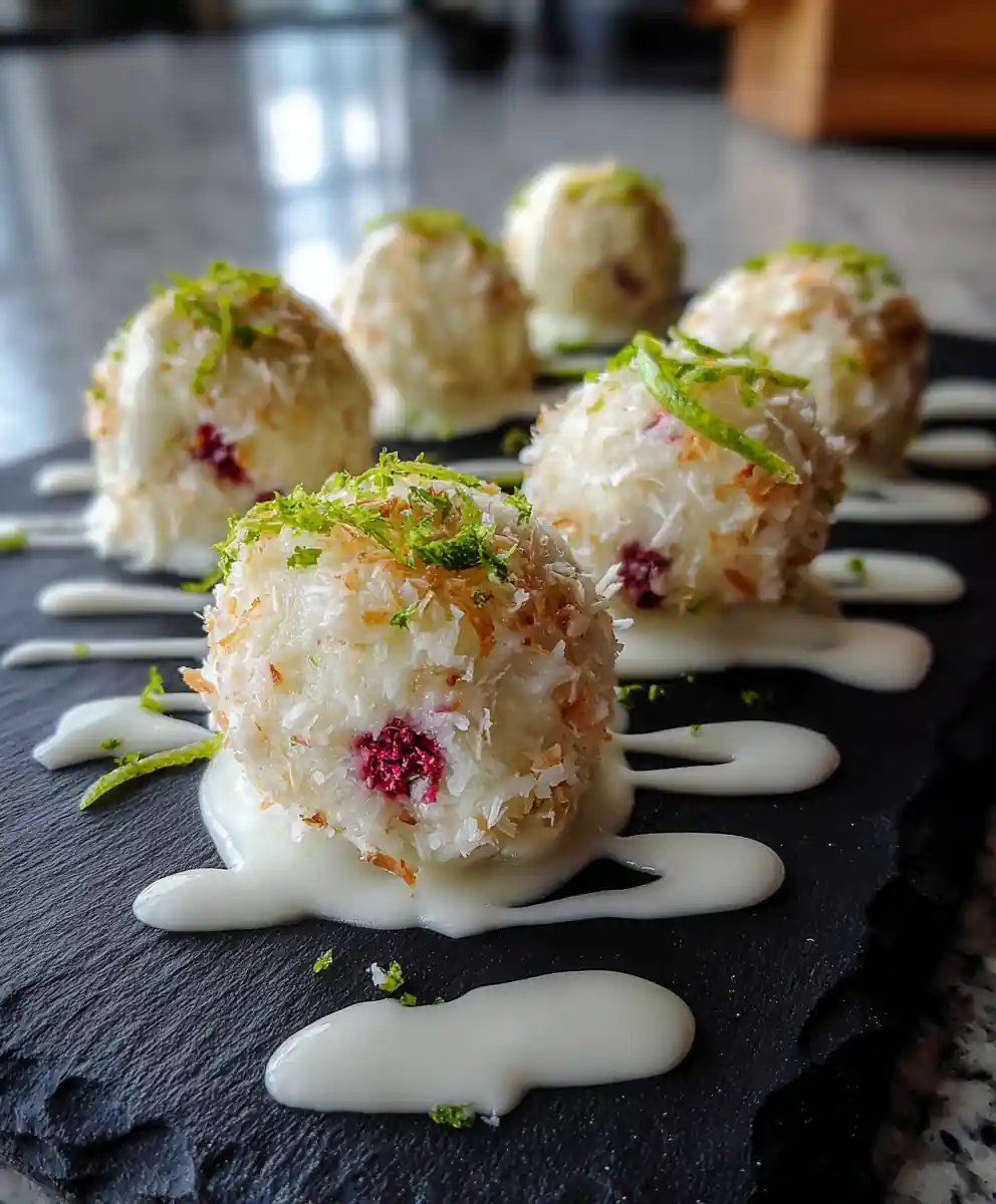 11. Plate and Garnish: Arrange the balls on a serving plate. Drizzle any remaining white chocolate ganache in an artistic line. Finish with a sprinkle of toasted coconut and a few fresh lime zest curls for a final touch of elegance.