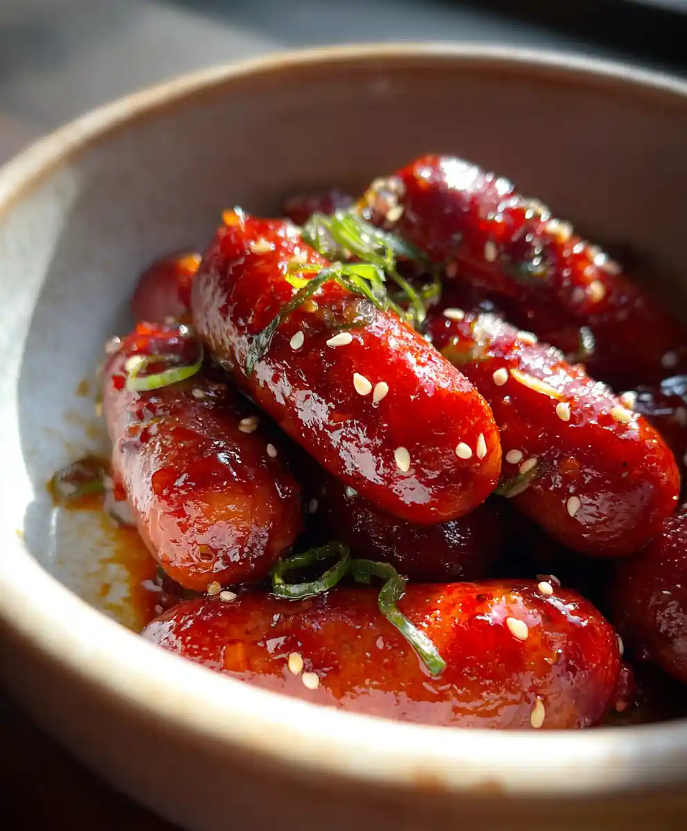 - Garnish and Serve: Carefully transfer the glazed sausages to a shallow serving bowl. Generously sprinkle with the thinly sliced green onions and toasted sesame seeds for garnish before serving immediately.