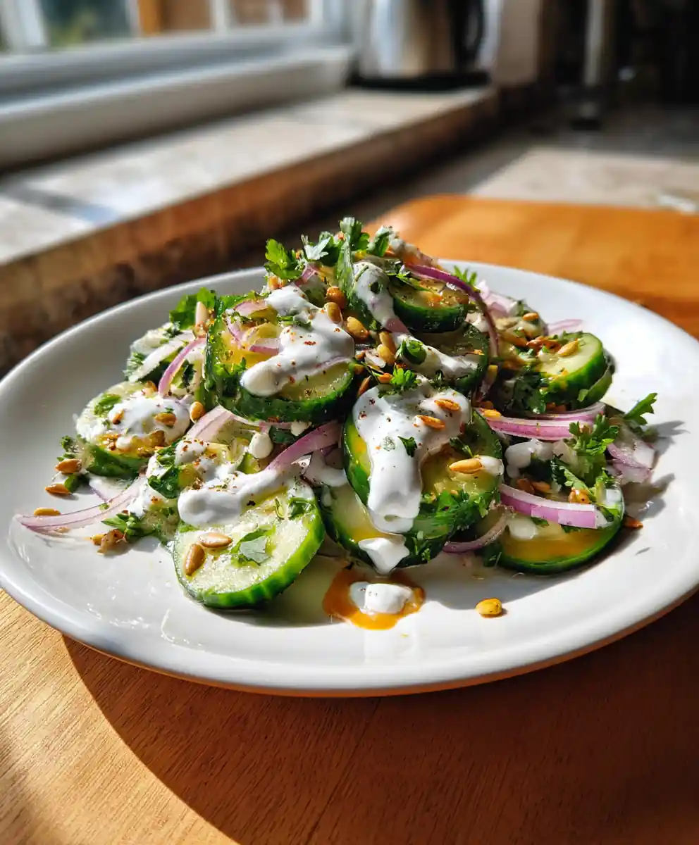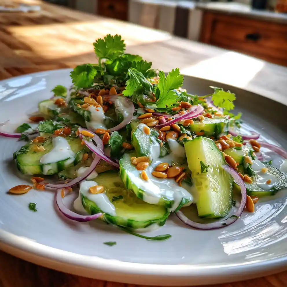6. Plate and Garnish: Spread a layer of the chilled cucumber salad onto a plate or bowl. Drizzle the avocado-yogurt crema over the salad in a decorative pattern. Sprinkle with toasted pepitas for crunch and finish with fresh cilantro leaves.