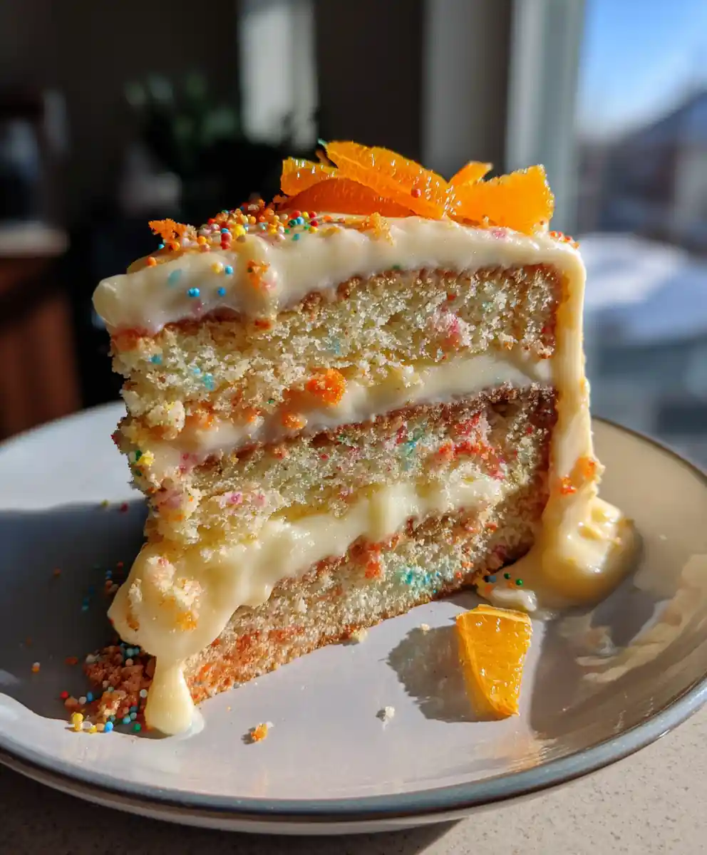 Always use fresh, room-temperature eggs for best lift. Keep butter and buttermilk chilled until ready to use. Store sprinkles in a cool, dry place to prevent clumping. Do not overmix cake batter to avoid a tough cake. Ensure all cake layers are completely cooled before frosting to prevent melting. If cake rounds feel dry during assembly, add more milk soak. Leftover cake scraps can be formed into a fourth layer or used as extra base crumb. For garnish, prepare candied orange peel by simmering thin strips of zest in sugar syrup until translucent.