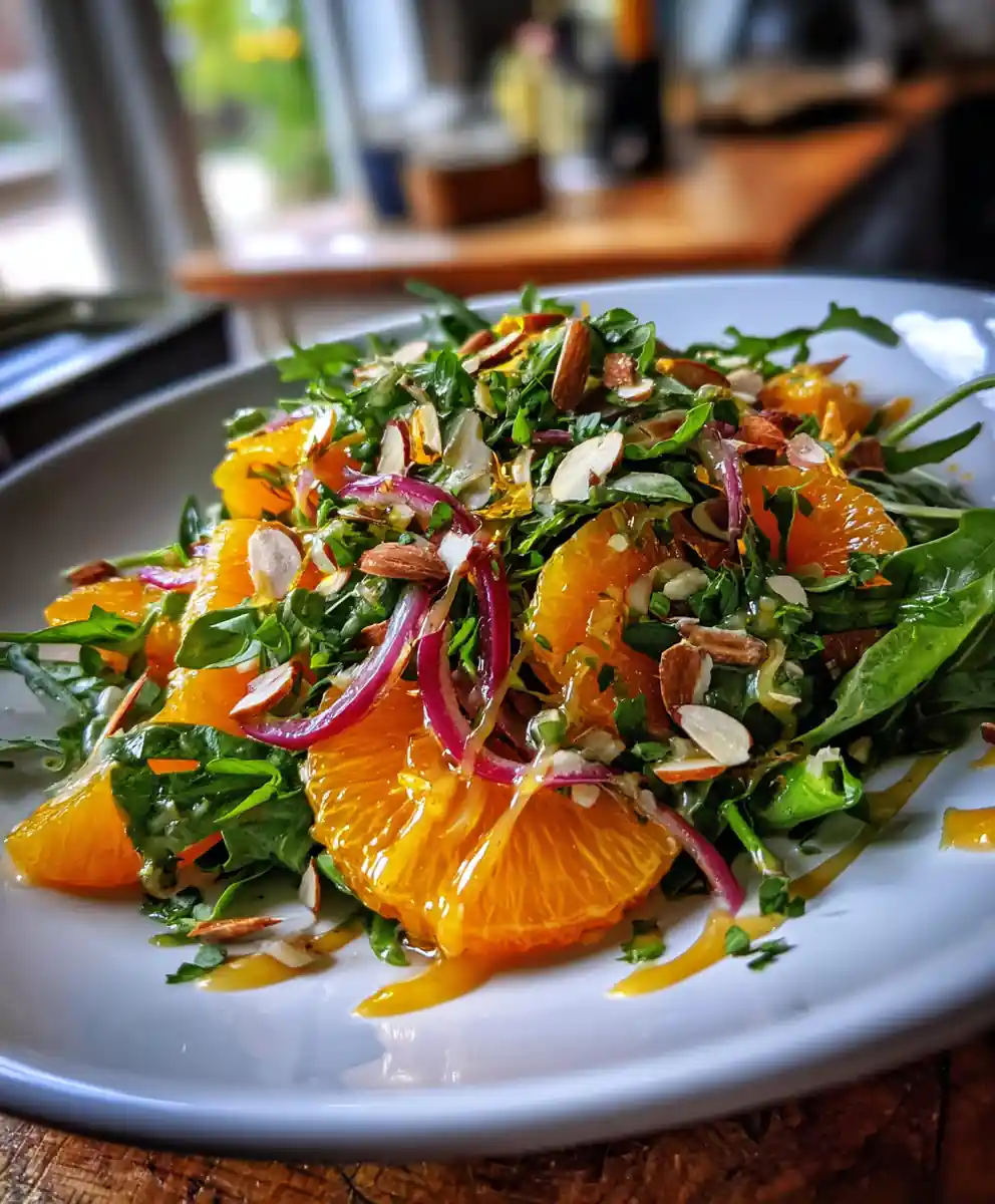 6. Plate with Flair: Arrange the dressed salad on a chilled white plate. This helps maintain the crispness of the greens. Fan out the remaining orange segments artfully on top of the greens.