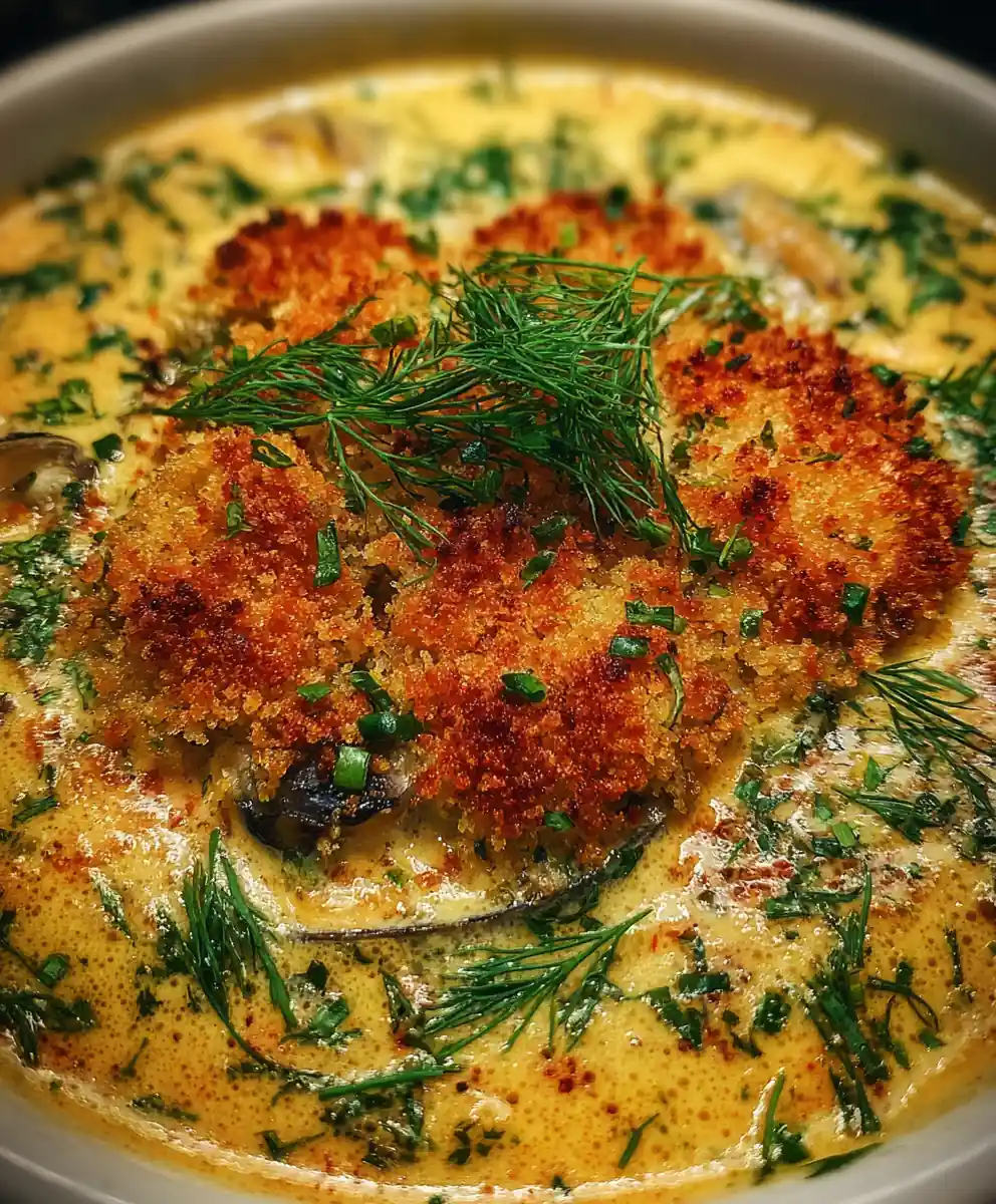 5. Season and Serve: Season your golden saffron and smoked paprika oyster stew recipe with canned oysters with white pepper and sea salt to taste. Adjust seasoning as needed until it’s perfectly balanced. Ladle the hearty stew into individual deep ceramic bowls and spoon a generous portion of the crispy dill panko topping over the center, with a fresh dill sprig for garnish.