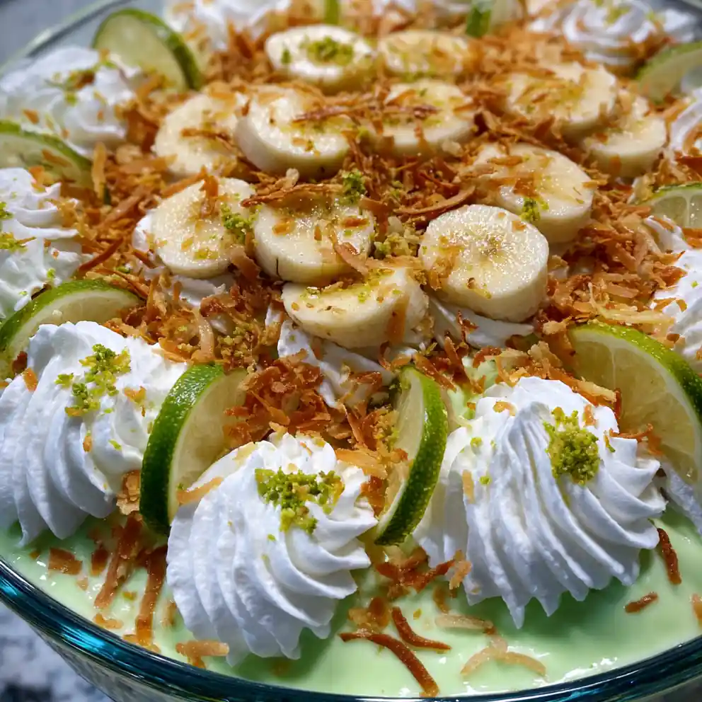 When ready to serve, scoop the banana pudding into individual clear glass dessert bowls or serve directly from the trifle bowl. Garnish each serving with a generous sprinkle of toasted shredded coconut for a golden crunch, and a delicate dusting of fresh lime zest over the whipped cream for a bright pop of color and aromatic finish. I always like to make this pudding the day before a party, so it has plenty of time to set up and get extra creamy.