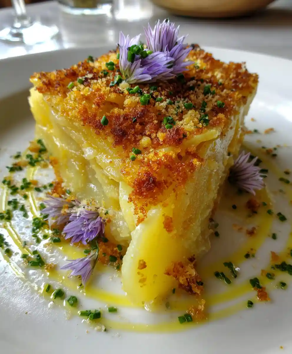 - Plating and Garnishing: Transfer a generous wedge of the scalloped potatoes to a white porcelain plate. Drizzle a thin spiral of extra-virgin olive oil around the plate rim for visual appeal and added flavor. Scatter sliced fresh chives over the top for a pop of color and freshness. If desired, garnish with a few edible violet flower petals for a touch of elegance.