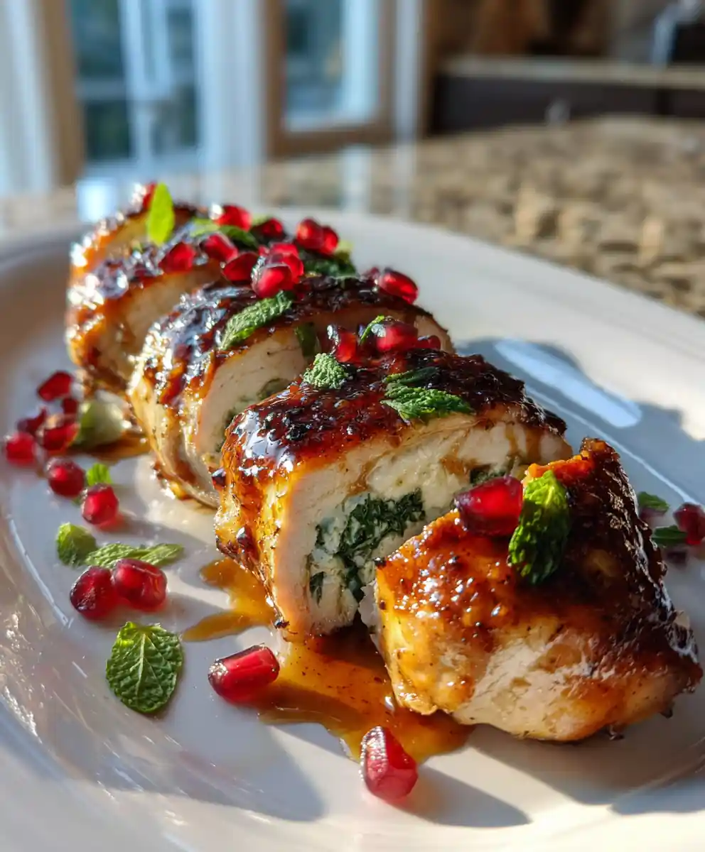 - Rest and Serve: Let the chicken rest for 5 minutes before slicing. This allows the juices to redistribute, resulting in a more tender and flavorful chicken. Slice each breast diagonally to reveal the creamy green filling. Arrange slices on a plate, drizzle with any remaining glaze, and garnish with chopped mint and pomegranate arils. Serve immediately.