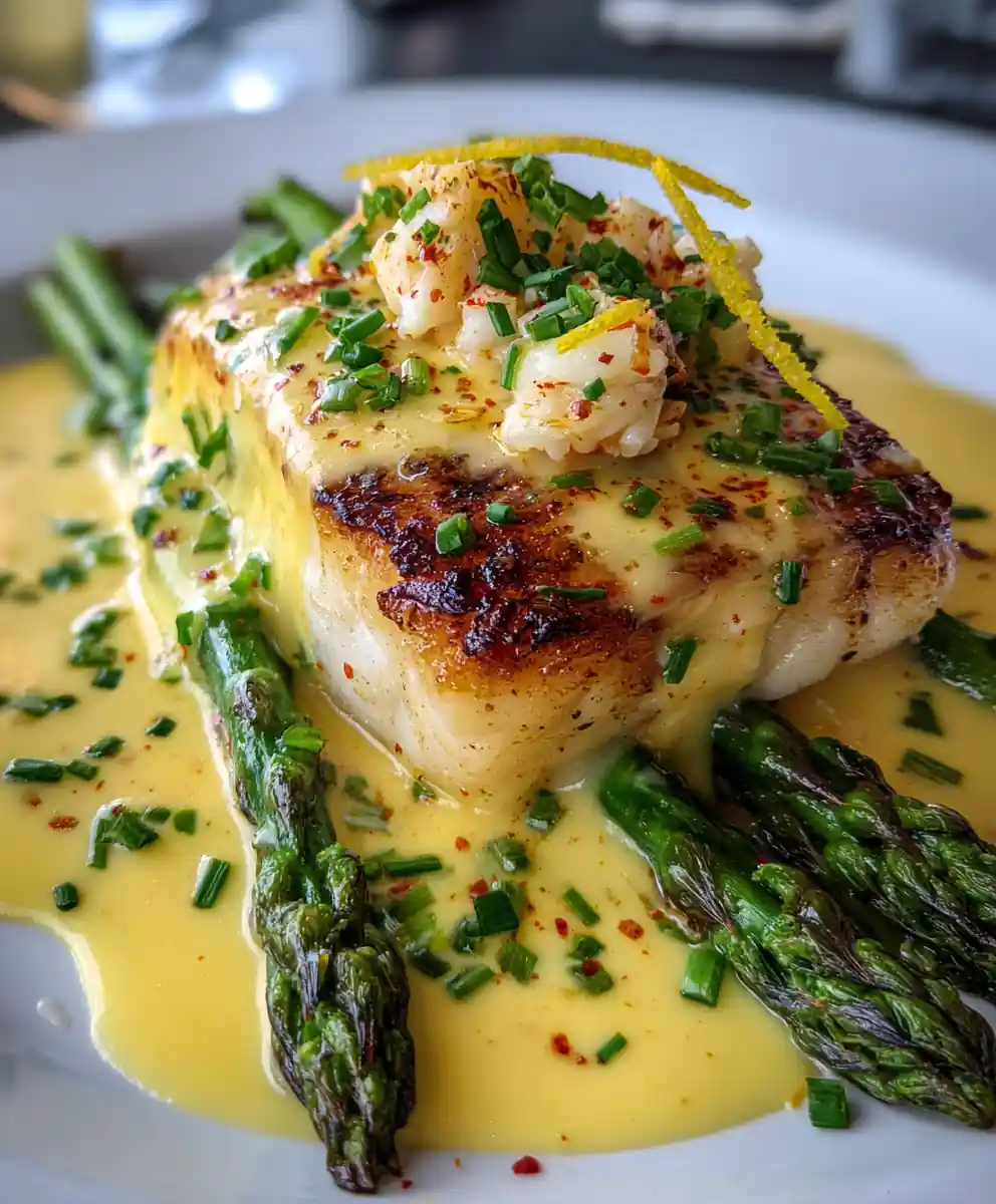 - Assemble the Halibut Oscar: Place one halibut fillet in the center of a white ceramic plate. Arrange three asparagus spears alongside the fish, overlapping them slightly for visual appeal. Spoon the warm hollandaise sauce generously over the fish, allowing it to cascade down the sides.