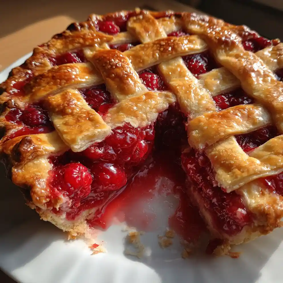 A classic raspberry pie featuring a vibrant ruby filling and an elegant lattice top, perfect for a family dessert. This recipe offers healthy eating options and dietary substitutions to accommodate various needs.