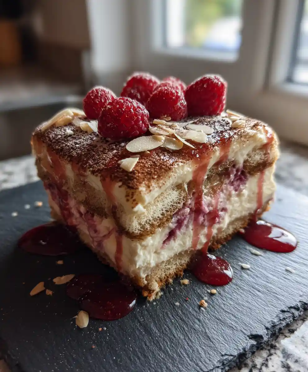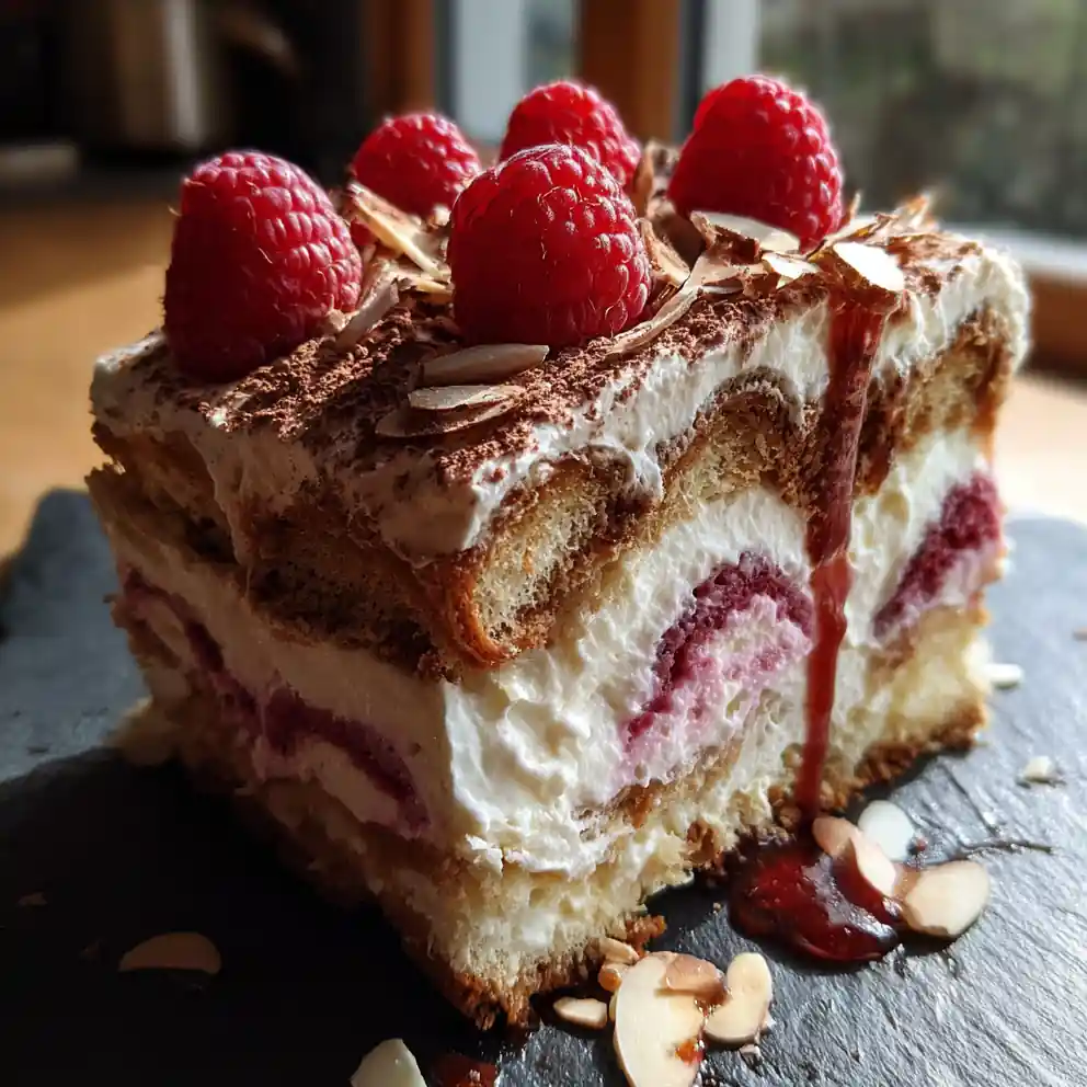 12. Garnish and Serve: Before serving, drizzle the cooled raspberry coulis over the top of the tiramisu in a decorative pattern. Dust lightly with cocoa powder for a touch of bitterness and visual contrast. Garnish with fresh raspberry halves and a sprinkle of toasted almond slivers (optional).