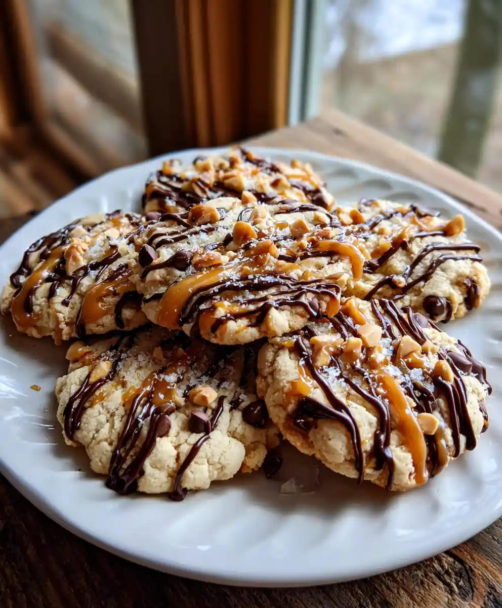 10. Chocolate Drizzle & Garnish: While the cookies cool, melt the dark chocolate in a heatproof bowl over simmering water or in short bursts in the microwave, stirring until smooth. Drizzle each cooled cookie with a thin line of melted dark chocolate, then immediately sprinkle with a few flakes of sea salt and extra chopped peanuts for added texture and flavor.